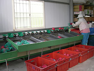 為 了避免果實損傷,分級時連帶網子(不過有些時候好像也沒有這樣用)一併輸送,減少果實滾下來時鱗片所造成的傷害